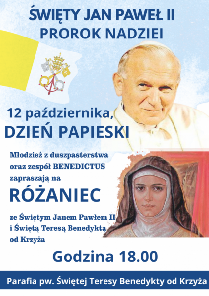 W najbliższą niedzielę, 12 października o godzinie 18:00 zapraszamy serdecznie na czuwanie modlitewne z różańcem, które przeżyjemy w wyjątkowym czasie – obchodząc XXV Dzień Papieski pod hasłem „Święty Jan Paweł II. Prorok nadziei”, a jednocześnie wspominając urodziny naszej Patronki, św. Teresy Benedykty od Krzyża (Edyty Stein). Spotkanie modlitewne poprowadzi Duszpasterstwo Młodzieży oraz zespół BENEDICTUS. Niech ta modlitwa będzie dla nas wszystkich czasem duchowego umocnienia i radości.