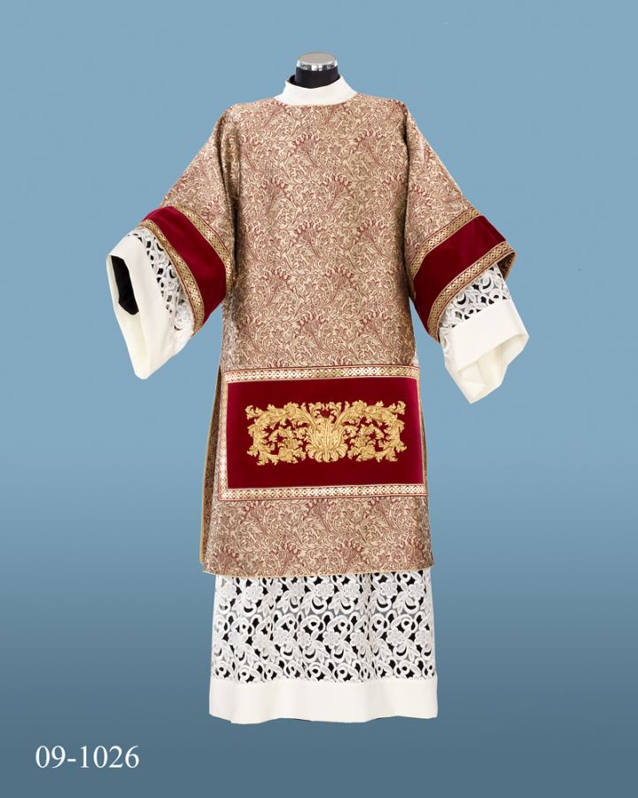 DIAKON, DALMATYKA – (gr. diakonos – sługa) – osoba duchowna posiadająca pierwszy stopień święceń kapłaństwa urzędowego. Diakon może sprawować: sakramenty chrztu świętego, małżeństwa i Komunii Świętej, odprawiać pogrzeb, błogosławić wiernych, poświęcać przedmioty kultu religijnego i głosić kazania. W Kościele łacińskim, podczas święceń diakonatu, kleryk przysięga celibat i modlitwę liturgią godzin (tzw. brewiarz). Diakonat jest udzielany w Kościele katolickim rok przed święceniami kapłańskimi. Istnieje również diakonat stały – posługa, którą mogą przyjąć i wykonywać dorośli (także żonaci) mężczyźni. Szatą liturgiczną diakona jest dalmatyka zakładana na albę i stułę. Jest znakiem urzędu diakona usługującego Chrystusowi Eucharystycznemu. Modlitwa kościelna przedstawia ją jako szatę radości i symbol nadprzyrodzonej sprawiedliwości.
